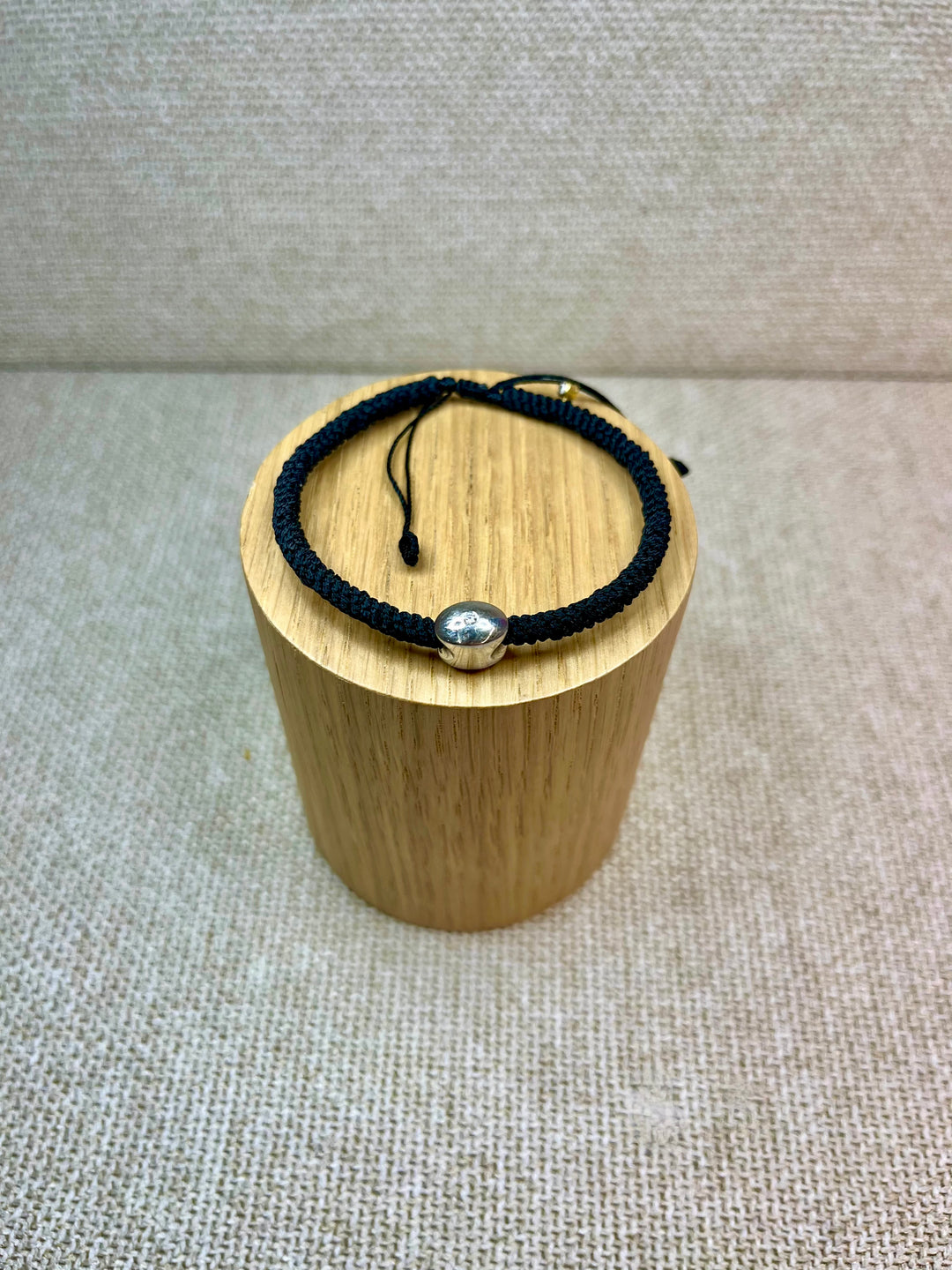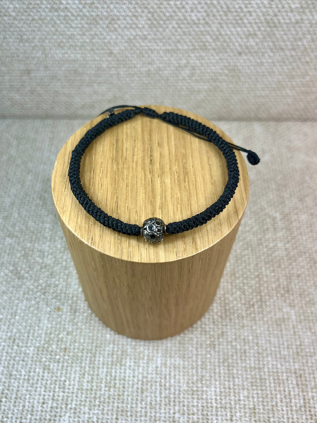 Opium. Sort, rundt og flettet armbånd m. 18 kt. hvidsguldskugle, m. sorte brillanter. Derudover m. en brillant ved lukning.