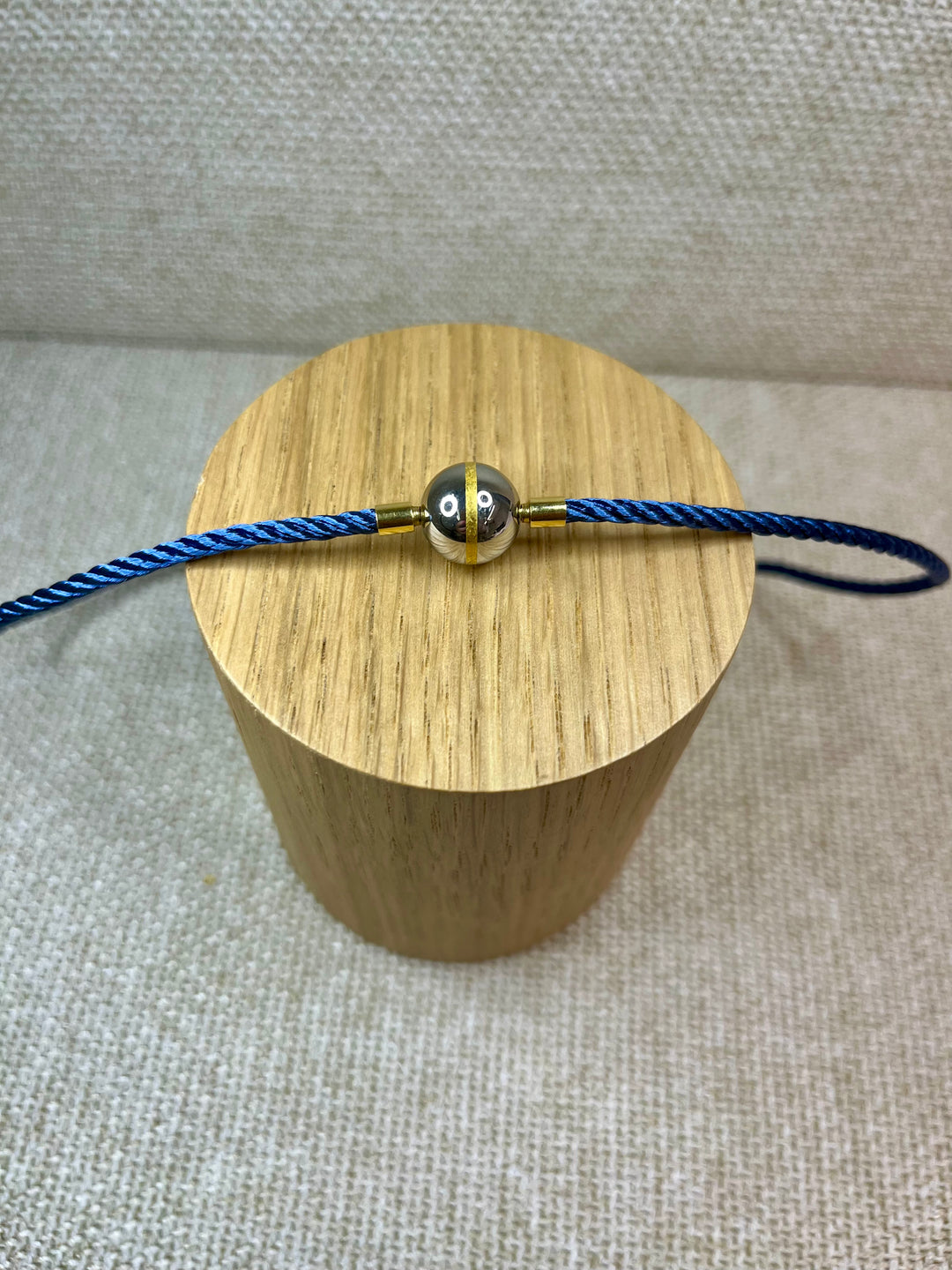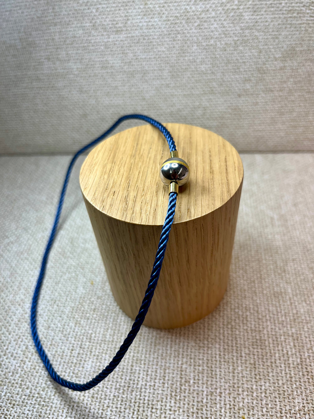 Jörg Heinz. Blå snoet silke snor m. aftagelig smykkelås i 14 kt. hvidguld/guld, som også kan bruges med andre kæder.